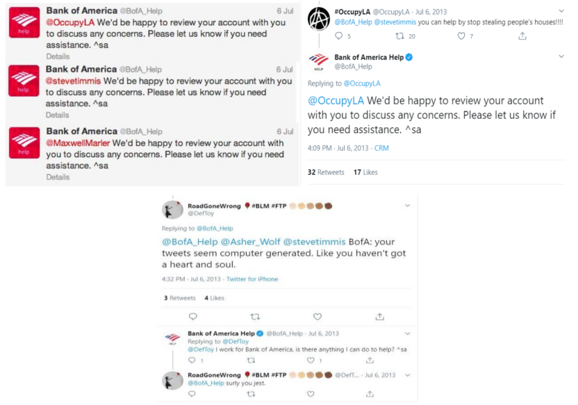 这种不确定性并非杞人忧天。2013年,美国银行的官方推特客服就上演了这样一幕:无论用户在讨论什么,该账号都只会反复发送同一条回复:“我们很乐意协助您审核账户,并讨论相关问题。如有需要,请随时告知。”这种千篇一律、机器人般的应对方式,很快便遭到用户的广泛质疑与嘲讽(如下图所示)。这一事件体现出文本沟通中“社会临场感”(Social Presence)的缺失,即用户无法感受到正在与一个“真实的人”进行互动。