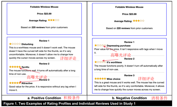 实验设计:实验选用一款无线鼠标作为目标产品。参与者首先看到该产品具有中立的平均评分(3星,基于220条评论),以此建立初始的中立态度,然后被随机分配到两种条件(积极或消极),然后阅读三则评论(示例:如图1)。