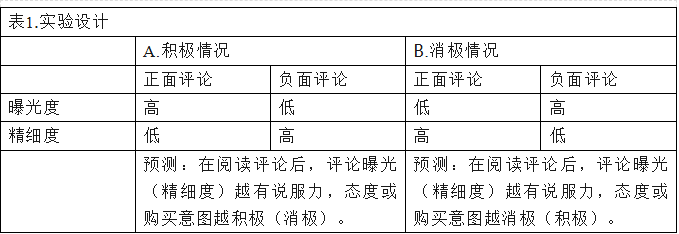 为了直接比较评论精细度(Type 2加工)和评论曝光度(Type 1加工)的相对影响力,文章采用了 “权衡实验” 设计。该设计的核心在于,让两种理论所预测的结果相互竞争,指向相反的方向。如表1所示设计了两种实验条件,通过产品的正面和负面评论来改变评论精细度和评论曝光度: